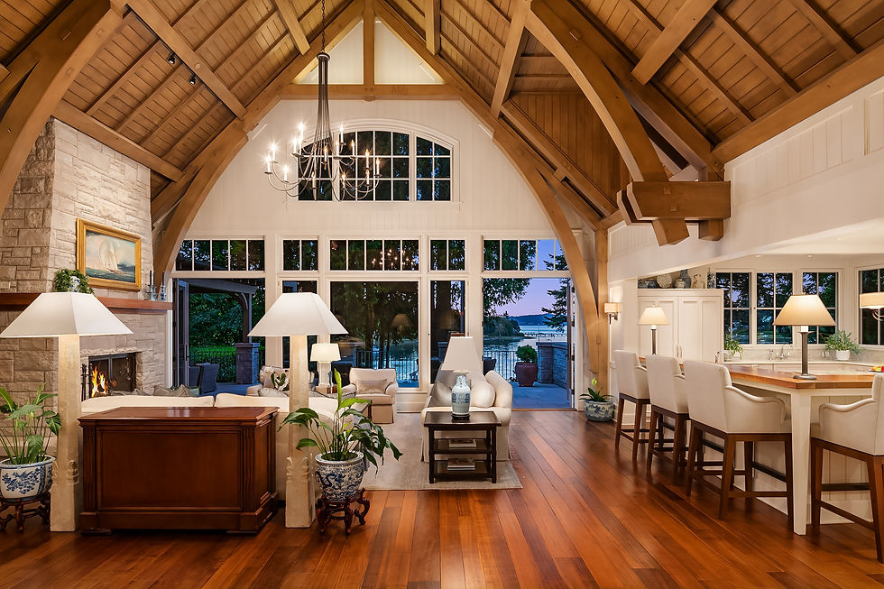 Waterfront custom luxury home with floor-to-ceiling windows and scenic views.